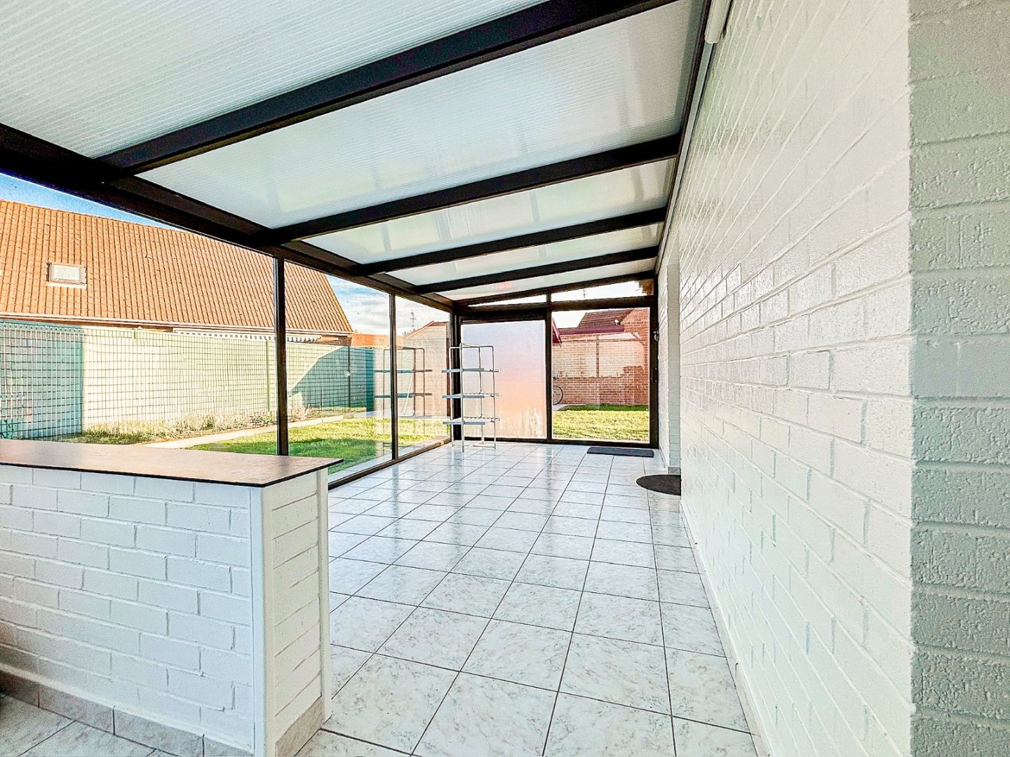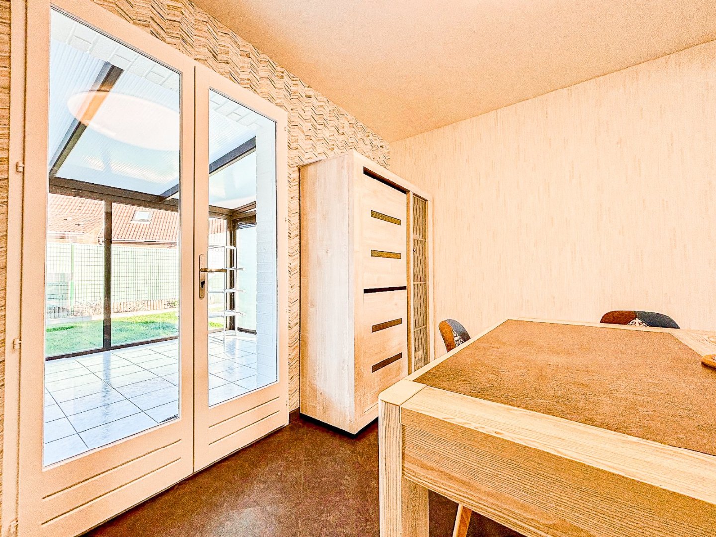 Sur un terrain de 400 m², elle dispose d'un séjour-salle à manger de 27,7 m² prolongé par une véranda de 23,4 m² : une orientation et des volumes qui laissent entrer une belle lumière matinale et offrent un espace de vie agréable toute l'année.